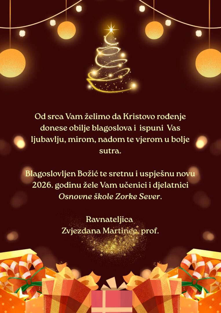 U ime svih djelatnika Osnovne škole Zorke Sever i u svoje osobno ime želim svima Vama da Vam Božić donese obilje blagoslova i srca ispuni ljubavlju i mirom, te nadom i vjerom u bolju i uspješniju 2026. godinu.