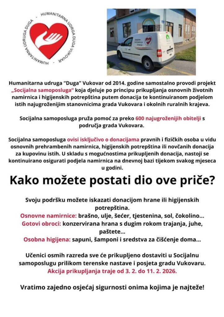Učenici osmih razreda sve će prikupljeno dostaviti u Socijalnu samoposlugu prilikom terenske nastave i posjeta gradu Vukovaru.
