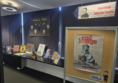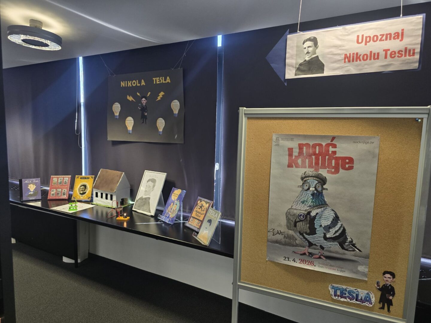 Osim aktivnog sudjelovanja u radionicama i slušaonicama, svi učenici i djelatnici škole mogu razgledati tematsku izložbu „Čovjek koji je rasvijetlio svijet“. Izložba na jednom mjestu okuplja nekoliko naslova iz fonda knjižnice koji se bave Teslinim životom i radom, ali i impresivne učeničke radove. Među eksponatima se posebno ističu maketa Tesline rodne kuće u Smiljanu, vjerni portret velikog izumitelja te praktični prikaz strujnog kruga koji su izradili sami učenici.