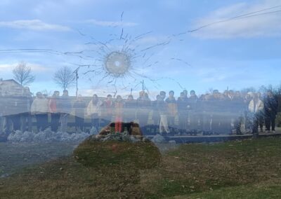 Smješten u prekrasnoj prirodi, spomenik “Slomljeni pejzaž” počinje stazom od 33 betonske ploče. Svaka ploča predstavlja godinu Ledererova života ili okvir role filma s brojevima utisnutim u beton. Gordanove snimke iz prvih dana rata, prikupljene u dokumentarcu Banijska ratna praskozorja, svjedoče o potresnim trenutcima: licima hrvatskih vojnika u jutarnjoj magli, njihovim razmišljanjima, pogledima i kretanju tijekom izviđanja neprijateljskih položaja.